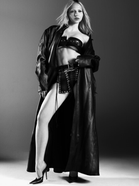Adela wears GEORGE KEBURIA jacket, FALKE tights, GIUSEPPE ZANOTTI shoes