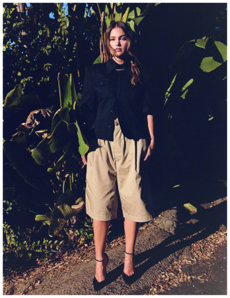 Olivia wears MIMCHIK blazer, THE FRANKIE SHOP trousers, FLEUR DU MAL underwear, SHAY JEWELRY earrings and rings, ALEVI MILANO shoes