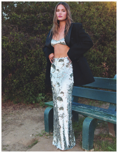Olivia wears THE FRANKIE SHOP blazer, THE NEW ARRIVALS İLKYAZ ÖZEL bra and maxi skirt, BLACK SUEDE STUDIO shoes, SHAY JEWELRY rings