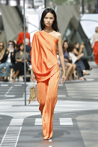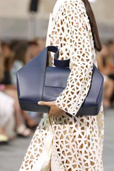 Pedro Del Hierro’s collection reflected a desire to feel transported within your own city. Inspired by endless summer nights, this collection centred around spontaneity and the feeling of finding a new perspective within the already familiar. The Spanish menswear brand showcased day-to-night versatility, from traditional office wear, including expertly tailored suits and shirts, to more contemporary interpretations featuring playful twists on classic pieces, such as bright colours, blended fabrics, and sheer materials. This colour palette, inspired by the hues of a sunset, was also reflected in the womenswear section of the collection, featuring beautifully tailored power suits as well as glamorous evening gowns. A striking consistency emerged with the reinterpretation of a gold beaded piece, repeatedly constructed as bags, straps, necklaces, and even connected into a material worn as a top. This reinforced the collection’s theme of day-to-night transformation, highlighting the idea of a single piece being reimagined and repurposed to tell different stories.