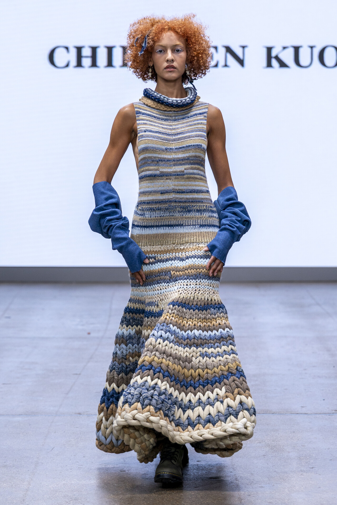 As a specialist in knitwear, Chih-Wen Kuo aims to challenge conventional perceptions of knitting, delivering garments that are simultaneously wearable and artistic. His collection, Sedimentation, reimagines the ancient act of knotting as a contemporary metaphor for memory and time, seeking to convey a modern, effortless, and street-inspired aesthetic through destruction and reconstruction.