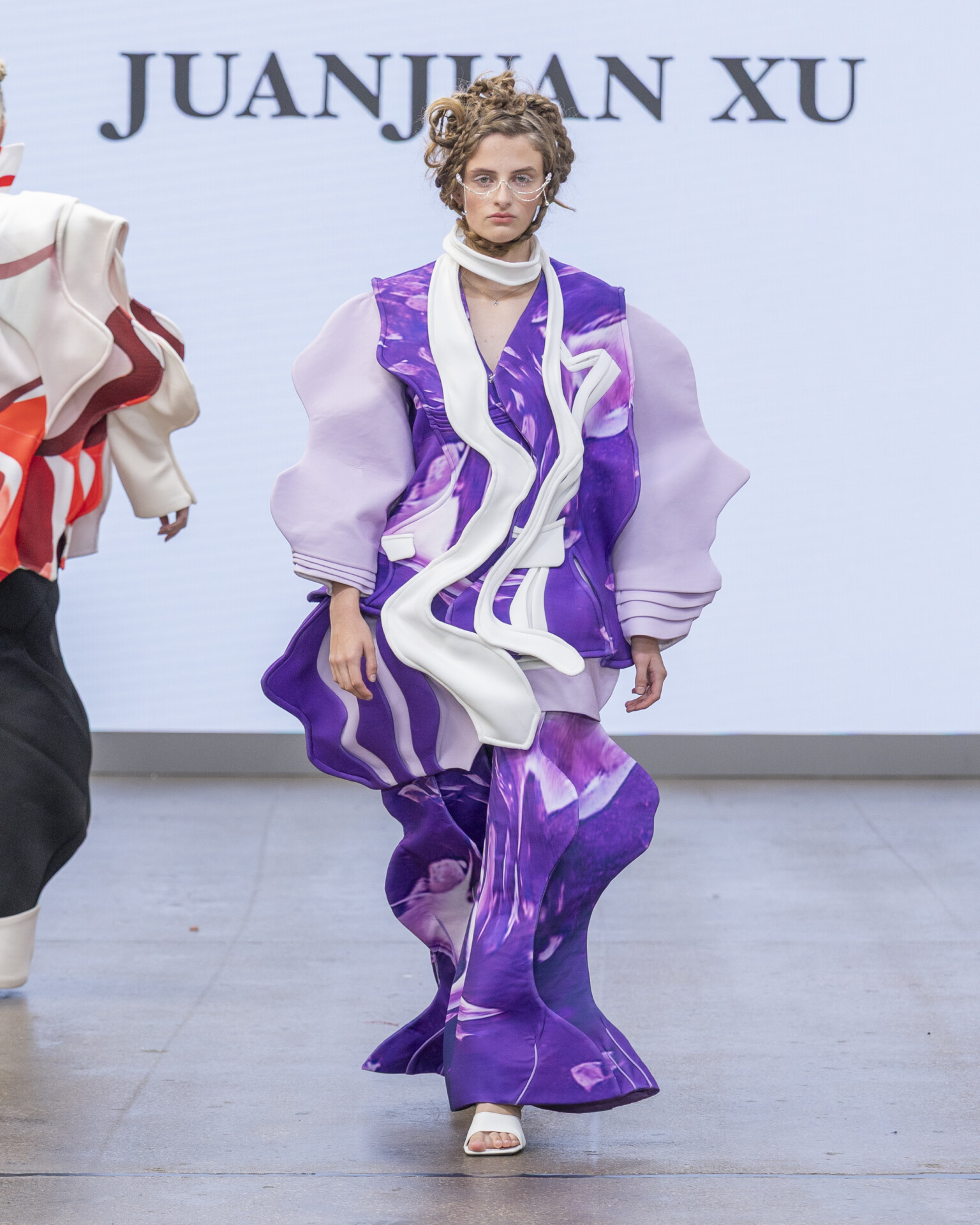 Juan-Juan Xu’s label, juanpak.o, is founded on the concept of “packing up creativity,” translating personal expression into tangible, innovative designs. Her collection, Inter-Shadow, uses sculptural silhouettes and shifting patterns to explore the dynamics of distance and connection between people in the contemporary world.