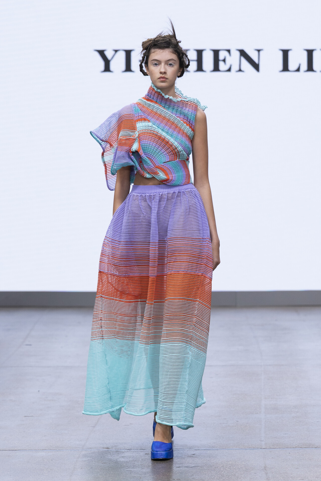 Yi-Zhen Lin’s newly founded brand, E.JEN, is committed to creating pieces that balance structure and emotion, offering a free and diverse fashion language. Her collection, Vivid Swirl, celebrates the beauty found within imperfection using kaleidoscopic color blocking and focusing on the interplay of softness and strength within the female form.
